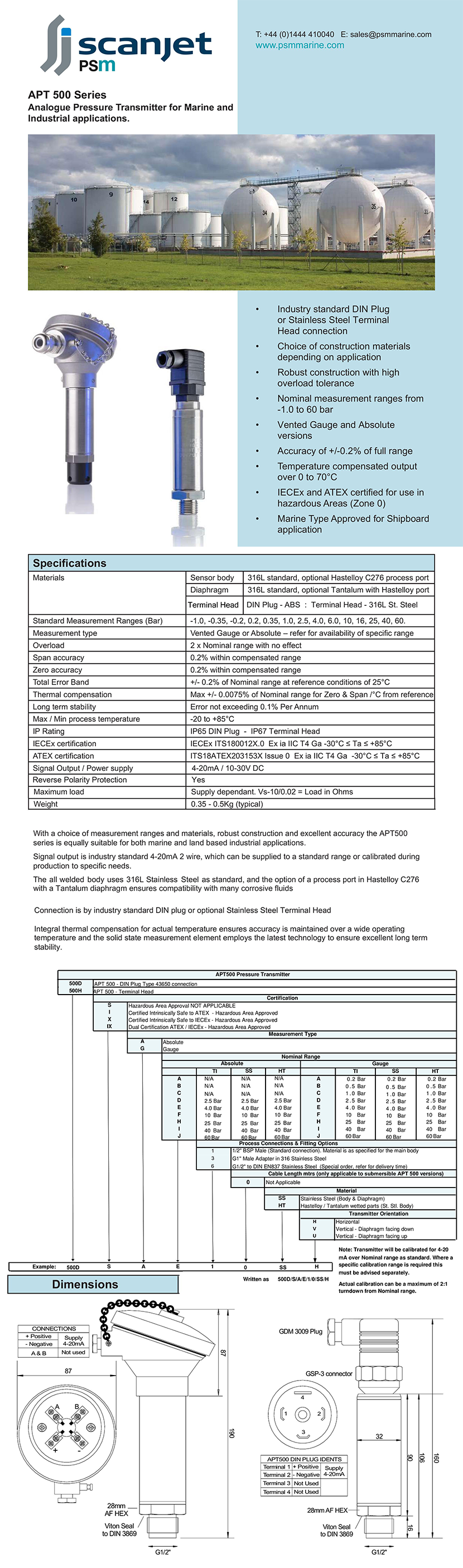 Industry standard DIN Plug or Stainless Steel Terminal Head connection; Robust construction with high overload tolerance ; Accuracy is maintained over a wide temperature; Excellent long term stability is ensured; Compatibility with many corrosive fluids; Certification for hazardous Areas (Zone 0) |