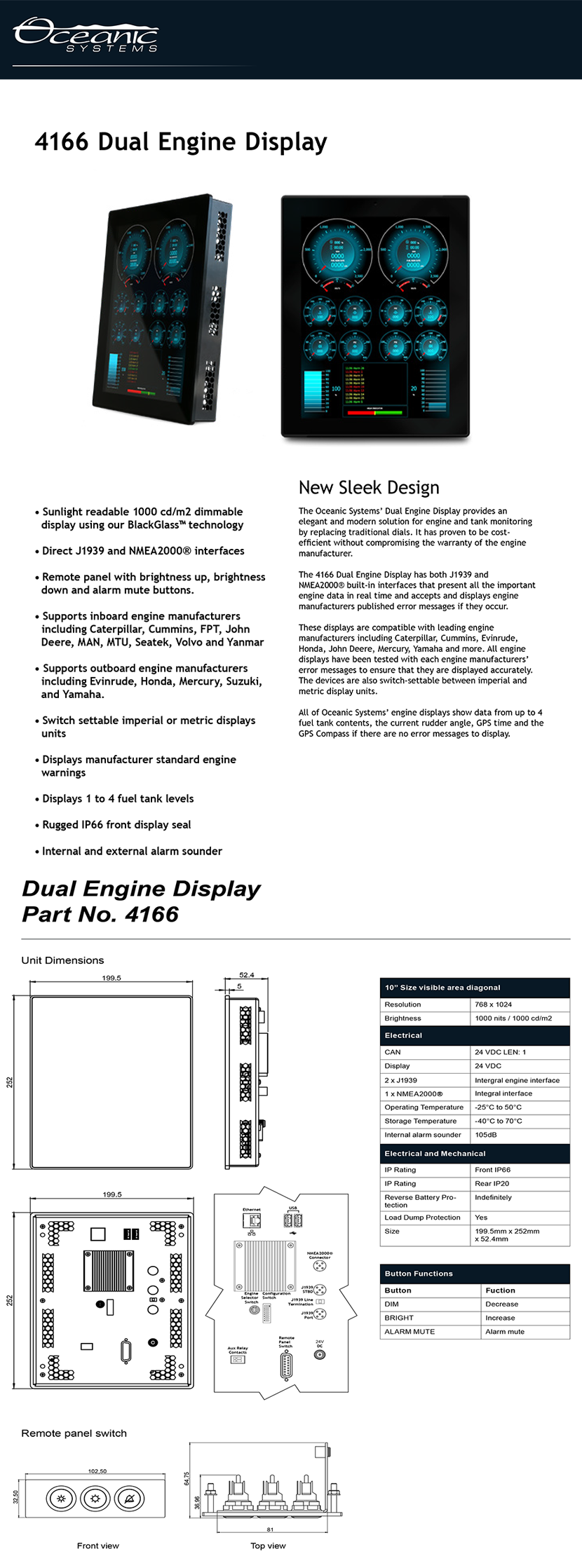 | 適配發(fā)動機品牌: | 舷內(nèi)機- Caterpillar, Cummins, FPT, John Deere, MAN, MTU, Seatek, Volvo, Yanmar;舷外機- Evinrude, Honda, Mercury, Suzuki, Yamaha | 防護等級: | IP66(Front)/ IP20(Rear) |
